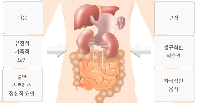 과민성 대장증후군 증상의 정확한 원인은 알려져 있지 않지만 심리적 요인, 과도한 스트레스, 유전적 요인, 특정 음식(매운 음식, 짠 음식), 위장염 등이 주요 원인이다. 또한 장 과민성, 위장 운동성 변화 및 위 팽창 감소도 관찰되었다. 사람에 따라 다르며 유전적 요인이나 신체적 요인에 의해 발생하기 쉽다.