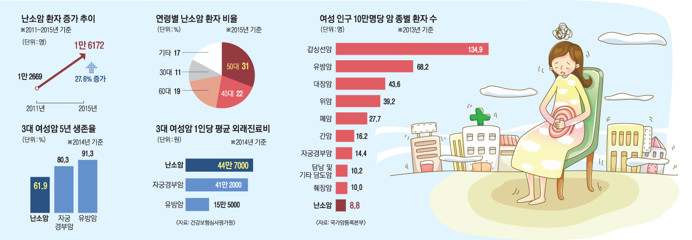 난소암은 난소에 발생하는 악성종양으로 50~70세 사이에 제일 많이 발생합니다. 국가암등록사업 통계에 의하면, 한국 여성 중 매년 2,500 여명이 새로이 난소암을 진단받고 있으며, 자궁 경부암에 이어 두 번째로 흔한 부인과 암입니다. 난소암의 약 90%를 차지하는 상피성 난소암은 대부분 3기 이상의 진행된 상태에서 발견되므로 5년 생존율이 아주 나빠 40%가 채 되지 않습니다.