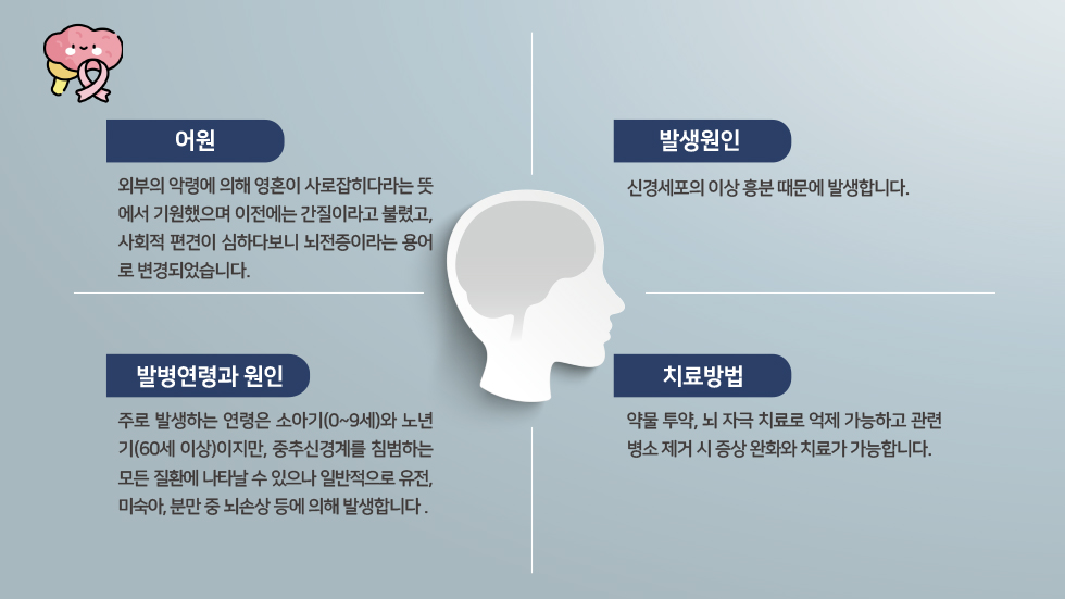 뇌전증을 일으키는 대표적인 질환을 연령에 따라 구별하게되면 다음과 같아요.