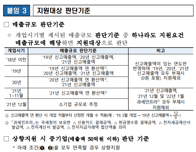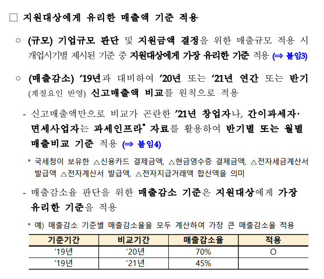지원 요건에 해당하는 매출 규모의 판단은 국세청에 신고된 금액을 기준으로 한다고 합니다. 그리고 매출 대상 기업에게 유리한 매출액을 적용해서 지급한다는 내용이 있습니다.