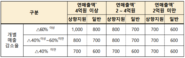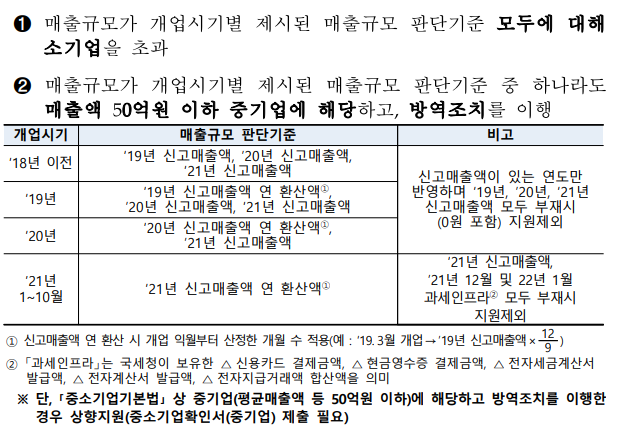 - 매출이 줄어든 소상공인, 소기업 그리고 연매출 10억원 ~ 50억원 이하의 중소기업