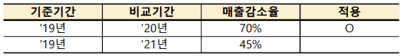 (매출감소) 부분에서 이의제기 할 문제가 도출되는 것 같습니다. 19년과 비교해서 20년 또는 21년 연간 또는 반기 신고매출액 비교를 원칙으로 적용한다고 하는데요. 무슨 말인지 저도 헷갈라서 곱씹어 보고 정리해 봤습니다.