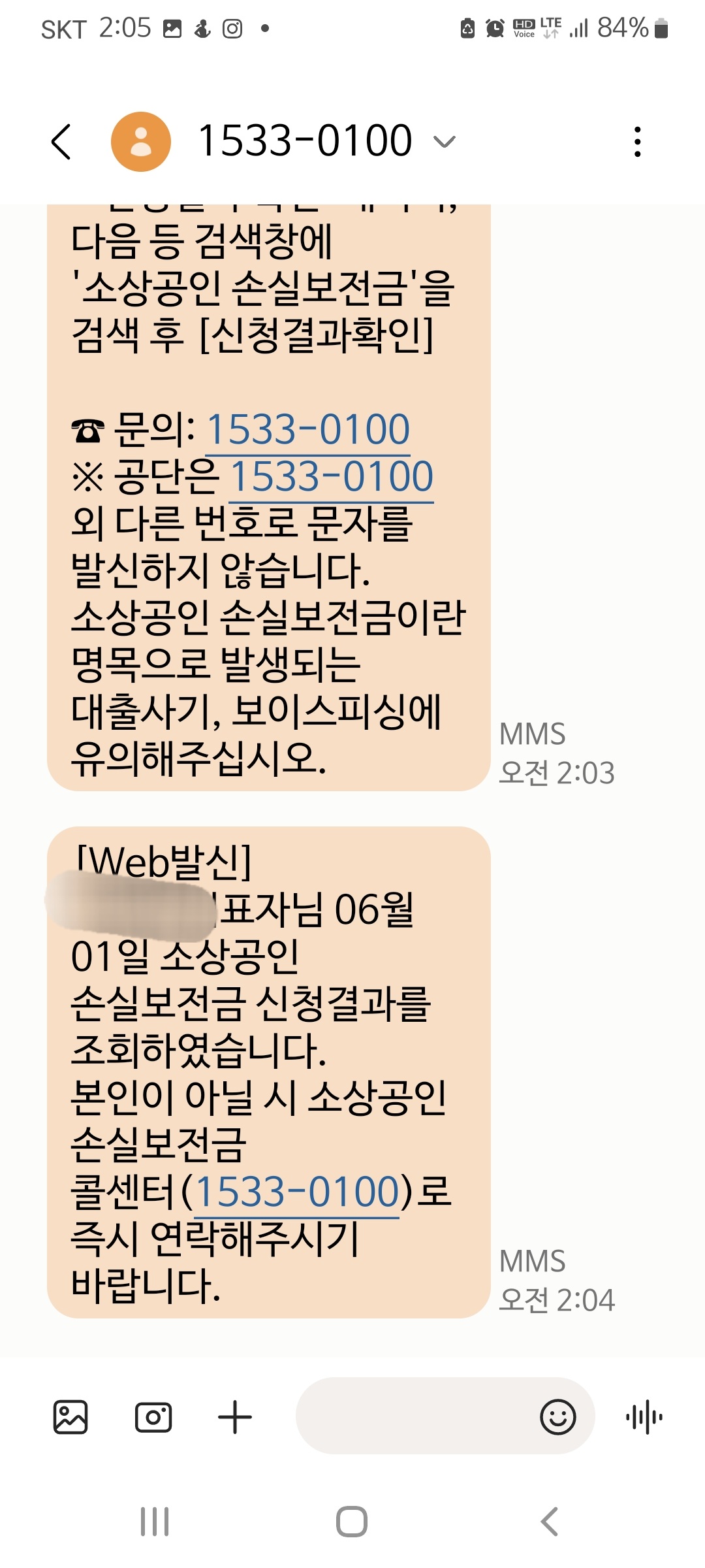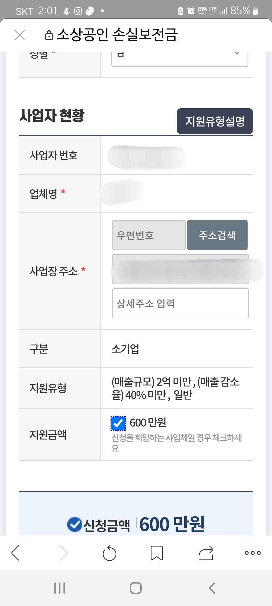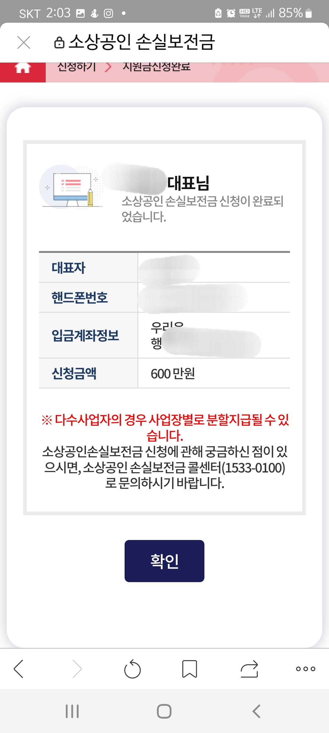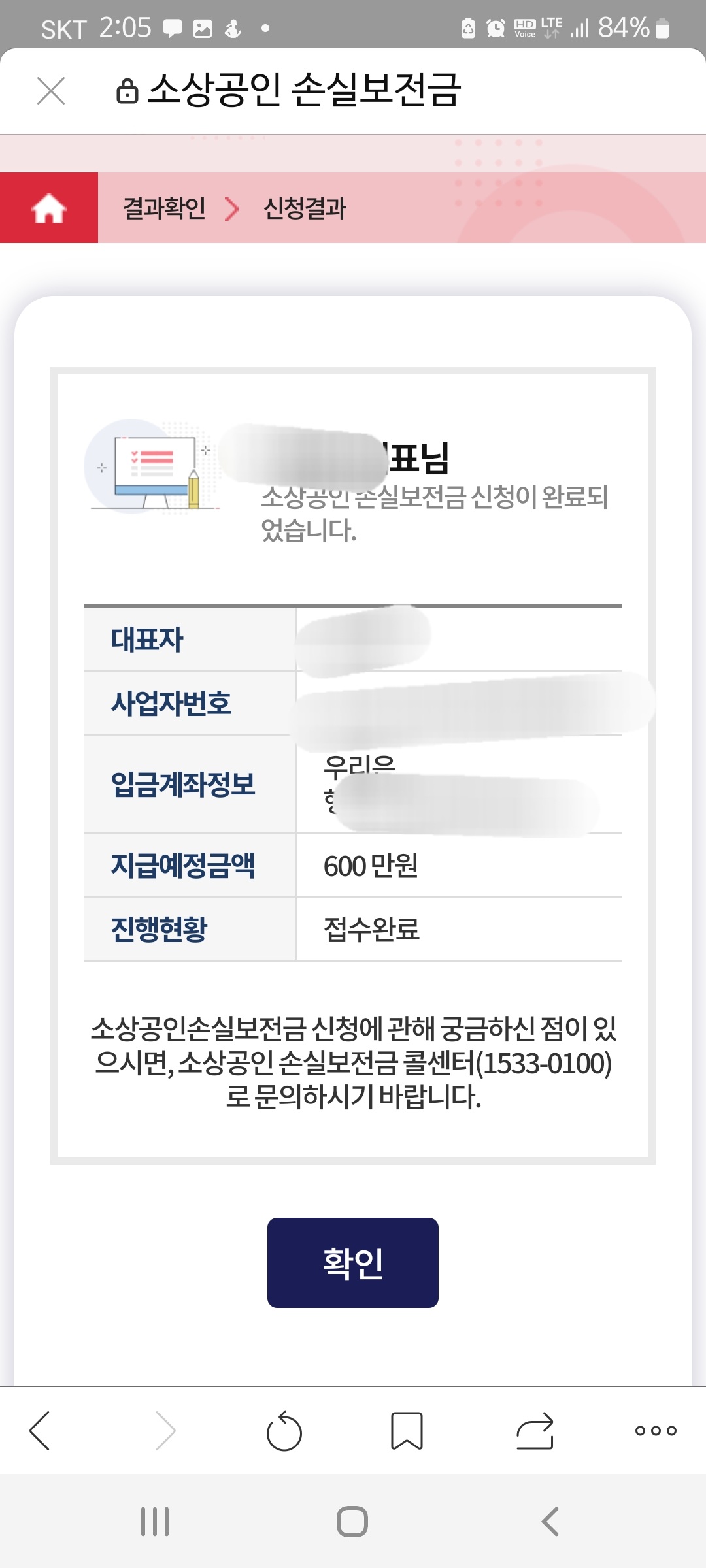 소상공인 손실보전금 600만원으로 정해져서 신청이 되었습니다. 뭘 선택하거나 빼거나 그런 거 없었어요. 그리고 신청하고 혹시 몰라서 다시 확인 과정을 거쳤습니다. 소상공인 손실보전금 신청 홈페이지에서 확인하기로 들어가서 진행했고요. 확인하니 다시 확인 문자도 왔습니다.