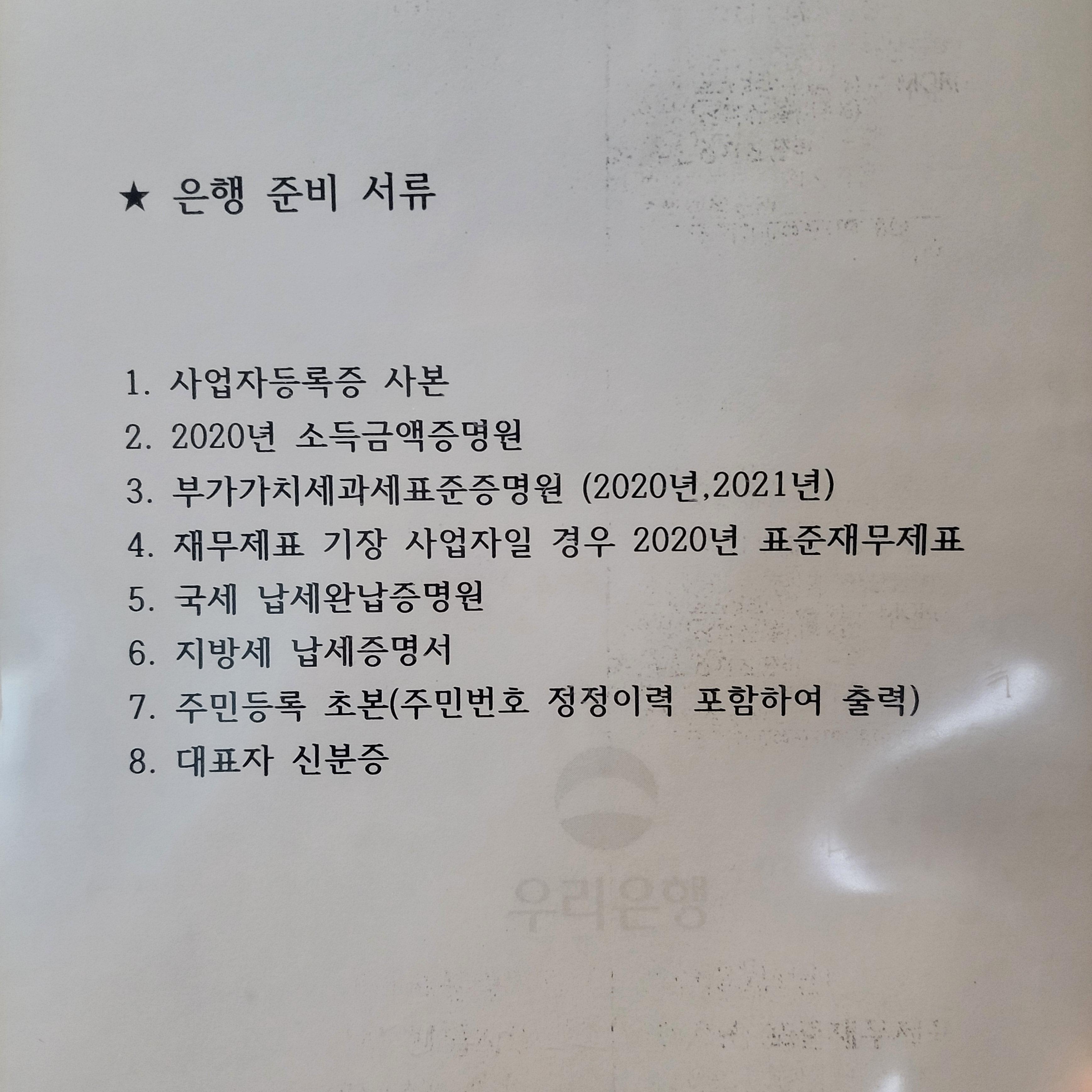 사진에서 동그라미 표시를 한 부분이 준비해야 할 서류입니다. 대부분 정부24나 국가기관에서 무료로 인증서만 있으면 발급받을 수 있습니다. 그리고 추가로 서류를 하나 더 주었는데요. 은행에 방문해서 은행 확인서를 받아와야 합니다.