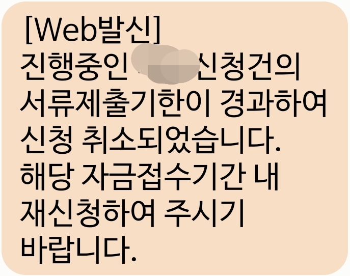 근데 서류가 부족했는지 2월 25일 오전 10시경에 기한 내 제출서류를 완료해야 한다고 문자가 왔습니다. 안타깝게도 저는 그냥 안 되는 줄 알고 소상공인 정책자금 홈페이지도 들어가 보지도 않고 심사 요구 내용을 보지도 않았는데요. 나중에 들어가서 보니 기본적인 증명서류라서 굉장히 허망했습니다. 또 제가 한심스러웠습니다.. 다음을 기약할 수밖에 없었습니다. 결국 3월 8일에 서류제출기한이 경과하여 신청이 취소되었다고 문자가 왔습니다.