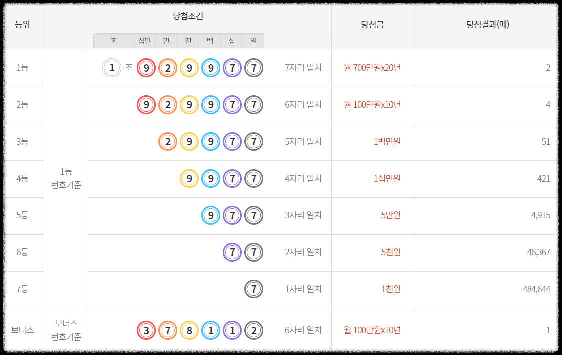 1등 당첨번호 - 1조 929977