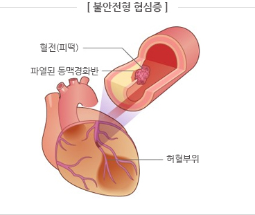 따라서 불안정형 협심증의 병태생리는 최근 심근경색증과 동일하므로 흔히 급성관상동맥증후군이라고 부른다. 국내에서는 최근 몇 년간 주요 병원에서 응급 심혈관 수술이나 스텐트 시술을 시행하고 있으며, 그 경과와 치료 효과가 크게 개선되고 있다.